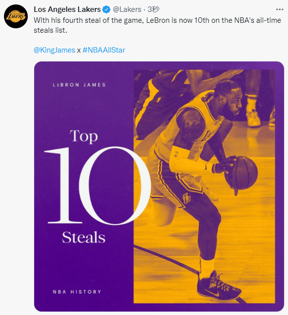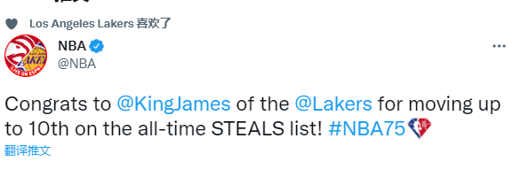 湖人官方第一时间恭喜詹姆斯破纪录,晒照并且发推写道:詹姆斯已经杀到历史抢断榜第10名;NBA官方也恭喜詹姆斯破纪录。