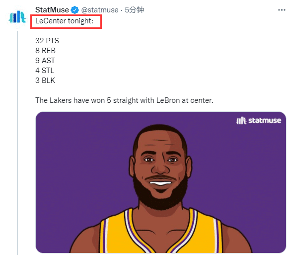 詹姆斯担任中锋期间,湖人5胜0负,期间湖人场均轰下127分,美媒直呼詹姆斯为LeCenter(勒中锋);从一号位打到五号位,并且从一号位防到五号位,詹姆斯太全能。