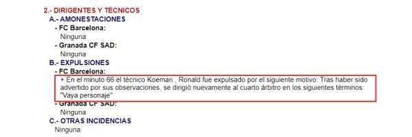 赛后,本场主裁冈萨雷斯-富埃特斯在比赛记录中写道:罗纳德-科曼因为对第四官员说 “你可真是个人物 ”(“vaya personaje”)而被罚下场。