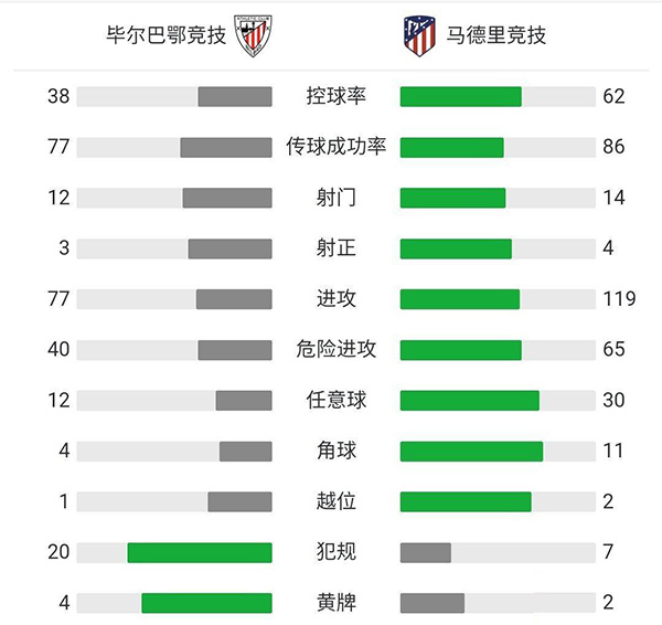 全场比赛结束,马德里竞技1-2毕尔巴鄂竞技。