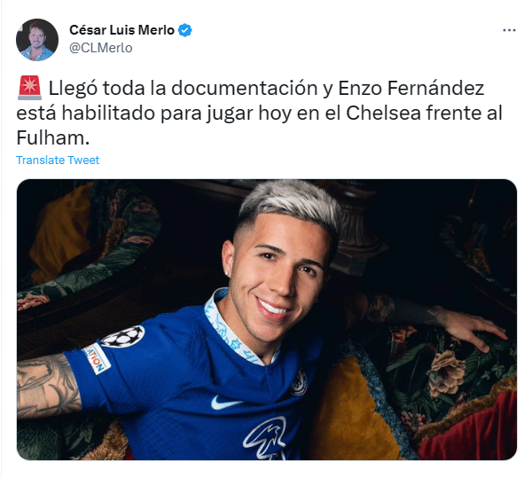 该记者写道:“所有文件都已齐全,恩佐·费尔南德斯有资格代表