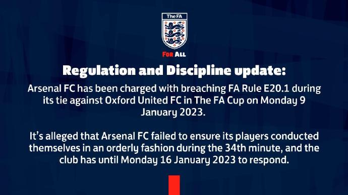 “阿森纳足球俱乐部被指控在对阵牛津联队的足总杯比赛中违反了英足总规则E20.1。阿森纳足球俱乐部未能确保其球员在第34分钟时以有序的方式进行比赛,俱乐部必须在2023年1月16日星期一之前对指控作出回应。”
