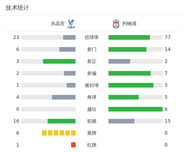 最终利物浦客场2-1逆转十人水晶宫暂登顶榜首。