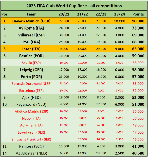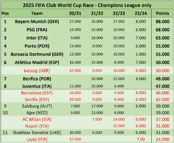根据国际足联的规则,32支参赛队中,有12个名额分配给了欧洲球队。其中,2021年至今的欧冠冠军,将获得参赛资格,同时,另外8支球队根据欧足联四年一度的「系数」排名决定。