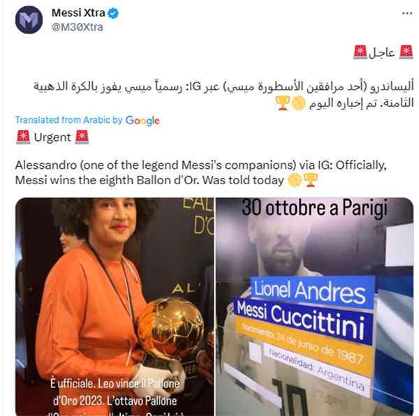这是梅西的挚友亚历山德罗意外透露:今天被正式地告知,梅西赢得了第八座金球奖。