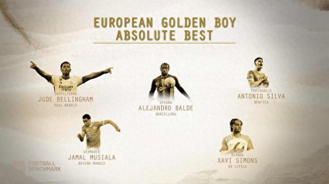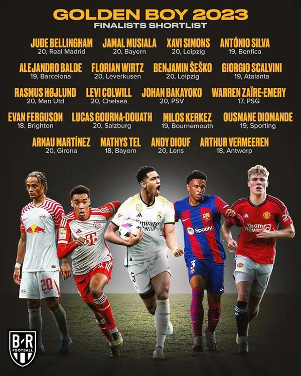 360直播10月13日金童奖25人名单公布,贝林厄姆、穆西亚拉、霍伊伦、特尔、埃文-弗格森、亚马尔入选。