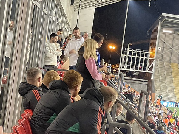 看台上的德赫亚得到了球迷的热情欢迎,他与两名朋友坐在一起,笑容满面。